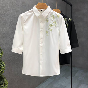 Design Detail: Green bamboo leaf embroidery on the shoulder/chest area